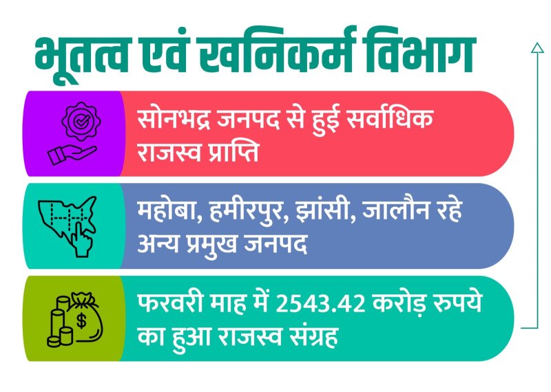 भूतत्व एवं खनिकर्म विभाग प्रदेश में अवैध खनन पर प्रभावी नियंत्रण और पर्यावरणीय मानकों का पालन सुनिश्चित करते हुए राजस्व संग्रह में वृद्धि सुनिश्चित कर रहा है। इस क्रम में खनिज एवं उपखनिज के खनन से फरवरी माह में सर्वाधिक राजस्व प्राप्ति सोनभद्र जनपद से हुई है। सोनभद्र जनपद ने मुख्य खनिजों के खनन से 402.79 करोड़ रुपये, जबकि उपखनिजों के खनन से 275.49 करोड़ रुपये का राजस्व अर्जित किया। वहीं महोबा ने 394.9 करोड़ रुपये, हमीरपुर ने 389.61 करोड़ रुपये का राजस्व संग्रह किया। जबकि झांसी से 215.83 करोड़ रुपये, जालौन से 225.62 करोड़ तथा सहारनपुर से 227.58 करोड़ रुपये के राजस्व की प्राप्ति दर्ज की गई।
