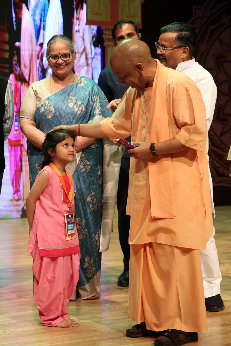 सीएम योगी ने कलाविदों व पूर्व छात्रों को किया सम्मानित, मंच पर पहुंची नन्ही बच्ची, सीएम ने उत्साहवर्धन किया, दी चॉकलेट