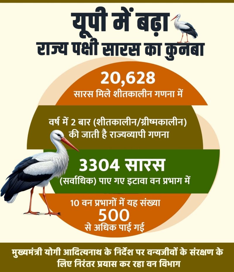 मुख्यमंत्री योगी आदित्यनाथ का पशु-पक्षी व पर्यावरण प्रेम जगजाहिर है। 2017 में सत्ता संभालने के बाद उन्होंने विभाग को राज्य पक्षी सारस के संरक्षण पर विशेष जोर दिया। 2023 में प्रदेश में 19,196 सारस मिले। 2024 में इनकी संख्या बढ़कर 19,994 हो गई। अब इस शीतकालीन सत्र में प्रदेश में कुल सारसों की संख्या 20,628 दर्ज की गई है।