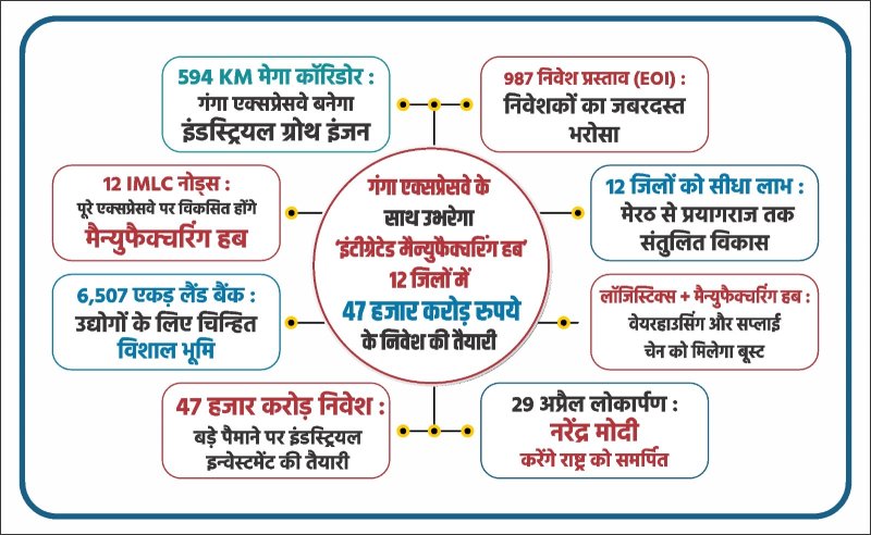 Lucknow, 26 Apr, 2026 04:55 PMलखनऊ, 26 अप्रैल। प्रधानमंत्री नरेंद्र मोदी 29 अप्रैल को हरदोई में गंगा एक्सप्रेसवे को देशवासियों को समर्पित करेंगे। योगी सरकार इस परियोजना को “एक्सप्रेसवे सह इंडस्ट्रियल कॉरिडोर” मॉडल के रूप में आगे बढ़ा रही है। सरकार ने उत्तर प्रदेश में बुनियादी ढांचे को औद्योगिक विकास से जोड़ते हुए गंगा एक्सप्रेसवे को इंटीग्रेटेड मैन्युफैक्चरिंग एंड लॉजिस्टिक्स क्लस्टर (आईएमएलसी) के रूप में विकसित किया है। उत्तर प्रदेश एक्सप्रेसवे औद्योगिक विकास प्राधिकरण की इस योजना के तहत 594 किमी लंबे एक्सप्रेसवे के किनारे 12 औद्योगिक नोड्स विकसित किए जा रहे हैं, जिनके लिए 6,507 एकड़ भूमि चिन्हित की गई है। अब तक 987 निवेश प्रस्ताव प्राप्त हो चुके हैं, जिनके जरिए लगभग ₹47 हजार करोड़ के निवेश का लक्ष्य तय किया गया है। यह पूरी योजना 12 जिलों में औद्योगिक विकास का नया नेटवर्क खड़ा करेगी।